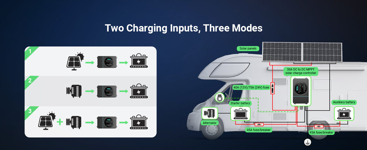- 【Intelligent Dual Power Input】Charging Supports both solar panel and engine power (EXT) inputs. With its advanced charging logic, this DC to DC charger prioritizes solar power when available. If solar power is insufficient, it uses both solar and generator power. When solar power is very low, it relies solely on the generator (starter battery) while keeping the starter battery within a safe voltage range. It provides a max of 30A total output regardless of the charging method.