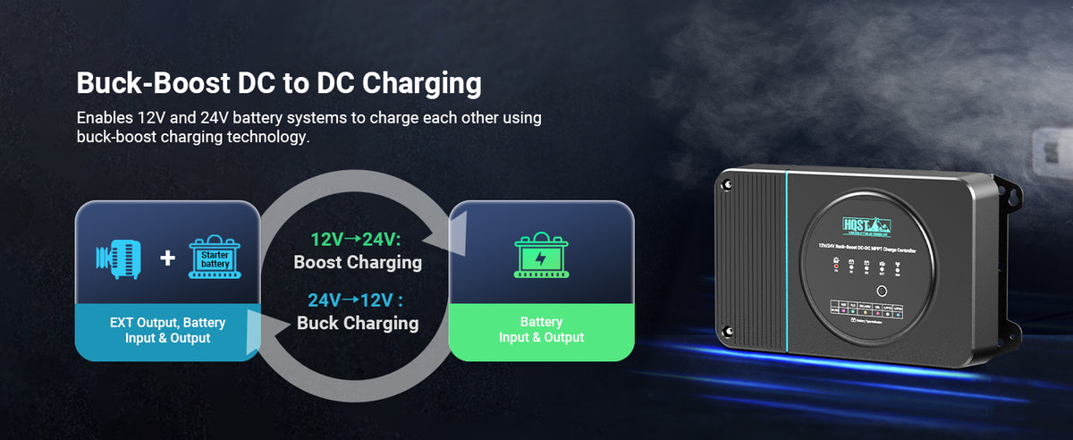 - 【12V-24V Buck Boost Battery Charger】Featuring buck and boost charging logic, this on board battery charger supports both 12V and 24V systems. It can boost 12V power to charge a 24V battery and buck 24V power to charge a 12V battery. This allows your auxiliary battery to charge your starter battery, and vice versa, if your battery systems have different voltages. Note that the buck and boost functions do not apply to solar array systems.