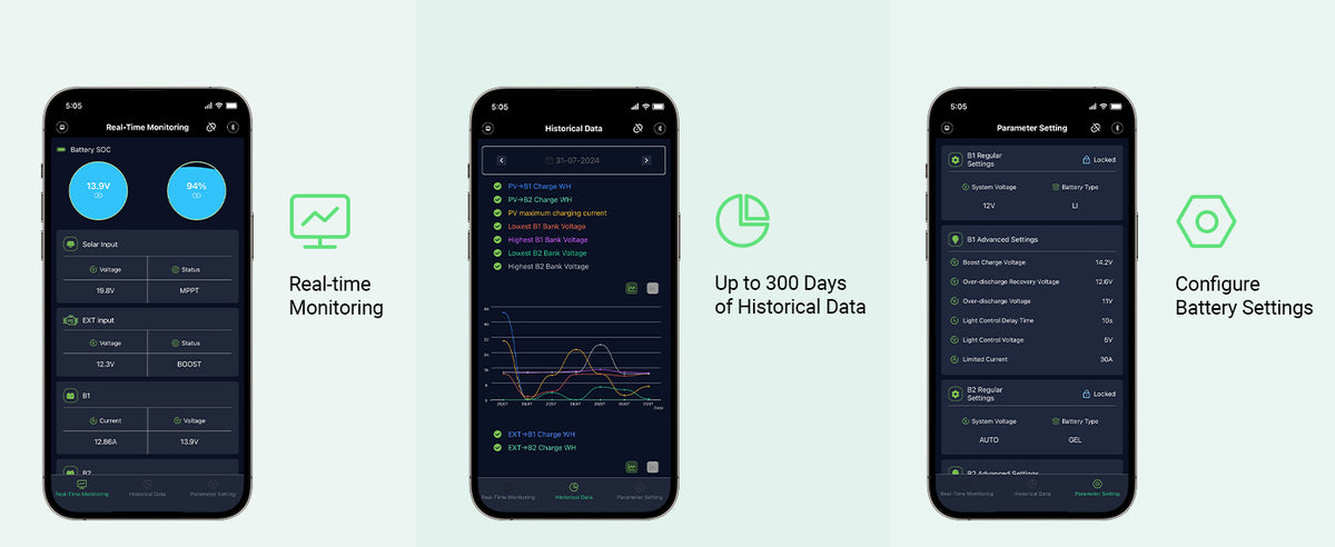 - 【Smart Bluetooth App Control & Monitoring】Equipped with a built-in Bluetooth module, this 12V/24V DC to DC battery charger works with the "ChargePro 2.0" app for real-time monitoring and stores up to 300 days of historical data. You can also set battery parameters easily via the app. Note: Bluetooth connection is effective within a 10m/33ft range (in an unobstructed area).