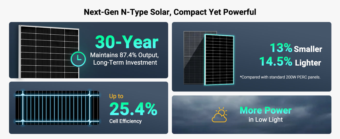 - Next-Gen N-Type Cells : Delivers up to 25.4% efficiency (vs. 23% from PERC panels) — generating more power per square inch even on cloudy or hot days.