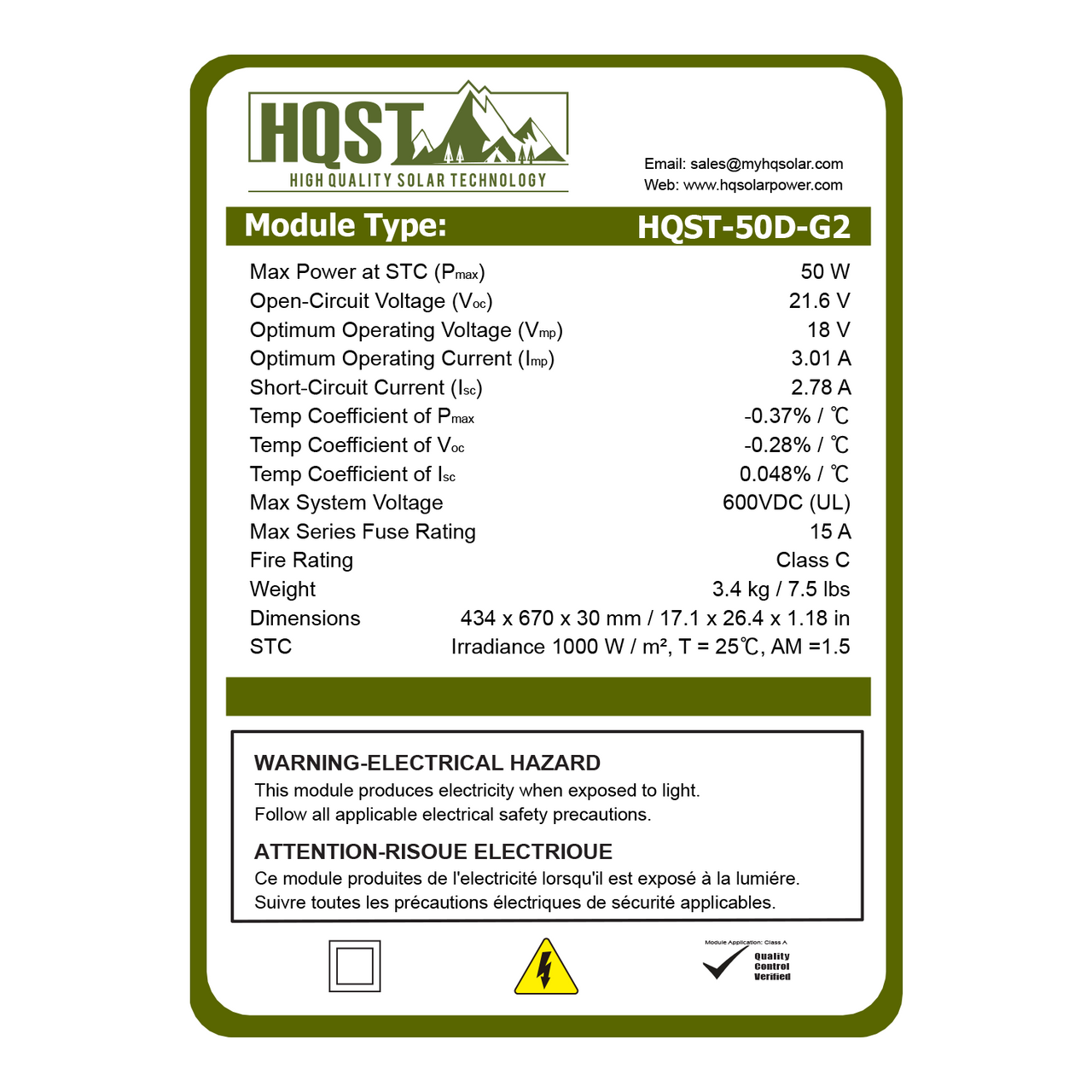 HQST 50 Watt 12 Volt Monocrystalline Solar Panel