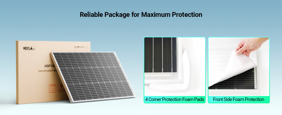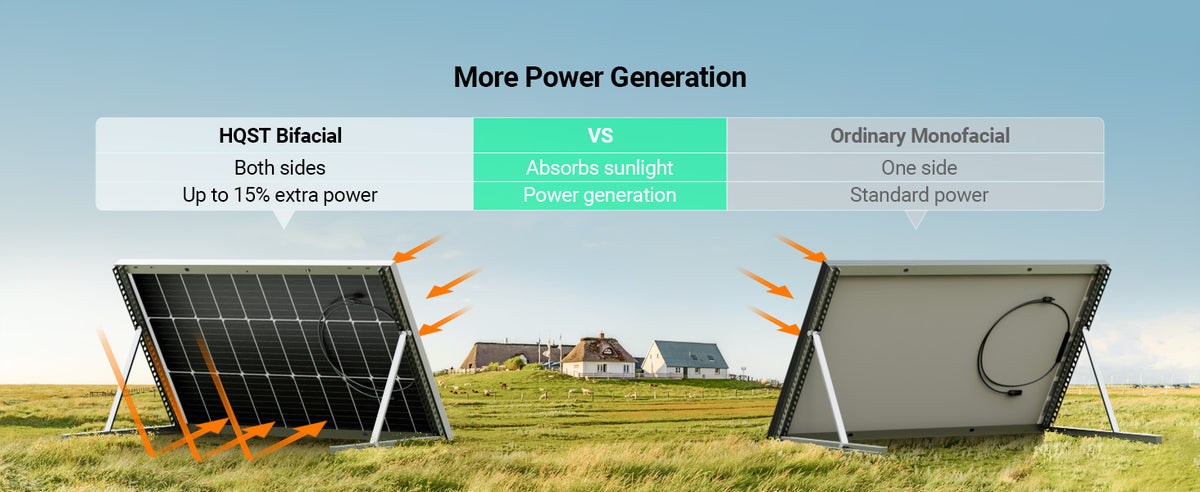 - 【Bifacial Tech, Up to 15%】Extra Power Designed with advanced bifacial technology, HQST 100W Solar Panels capture direct sunlight on the front and reflected sunlight (albedo) on the rear. The result? Up to 15% more energy output than traditional panels, delivering up to 115W of power from a 100W panel. Maximize your solar potential with HQST!
