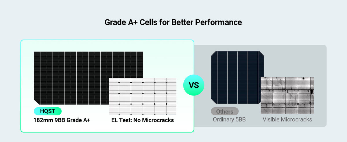 - 【Grade A+ Cells, Up to 25%】 Efficiency HQST 100W 12V solar panels feature advanced Grade A+ 9-busbar solar cells, rigorously tested with EL technology to ensure zero cracks. With an outstanding conversion rate of up to 25%, they outperform traditional panels and deliver better performance.