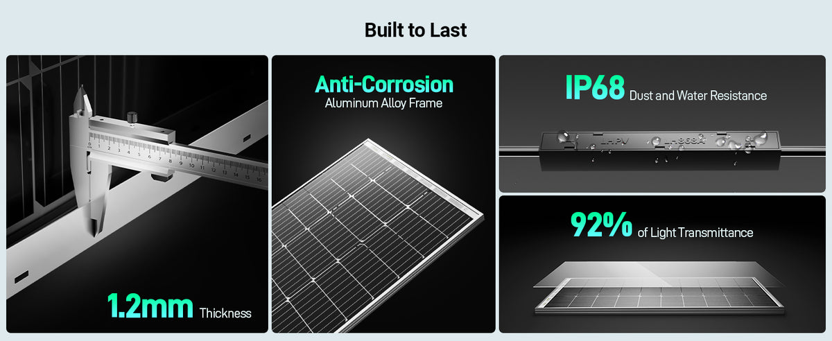 - 【Built to Last, A Smart Investment】 Rated IP68 for dust and water resistance, this 100W solar panel is built to withstand dirt, splashes, and rain with ease. Its anti-corrosion aluminum alloy frame ensures decades of outdoor reliability. Engineered to handle extreme conditions, it boasts 2400 Pa wind resistance and 5400 Pa snow load capacity. Delivering powerful energy output for up to 30 years, it’s a smart, long-lasting investment for sustainable power.