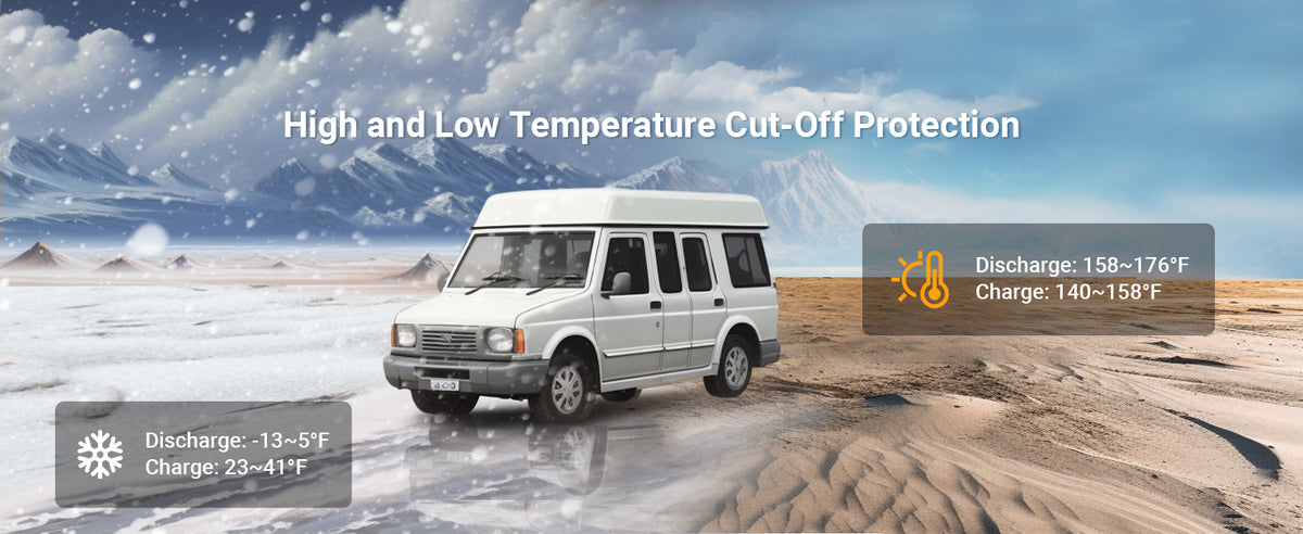 - [Low & High Temperature Protection] Equipped with low and high temperature cut-off protection, HQST LiFePO4 battery ensures safety during charging and discharging processes. When temperatures dip below 23℉ or rise above 140℉, the battery's charging is auto suspended to preserve its lifespan. Similarly, if temperatures fall below 5℉ or exceed 158℉, discharging will cease, maintaining optimal performance.
