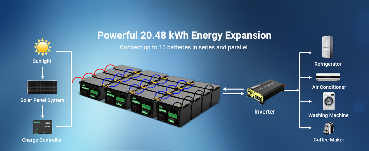 - [In Series & Parallel] Connections HQST's 12V 100Ah lithium battery supports series and parallel connections. You can create a 12V, 24V, 36V, or 48V battery bank via series wiring, a 12V 200Ah, 300Ah, or 400Ah power system via parallel connections, or even connect up to 16 batteries in series and parallel, building a powerful home backup power system with a 20.48 kWh capacity.