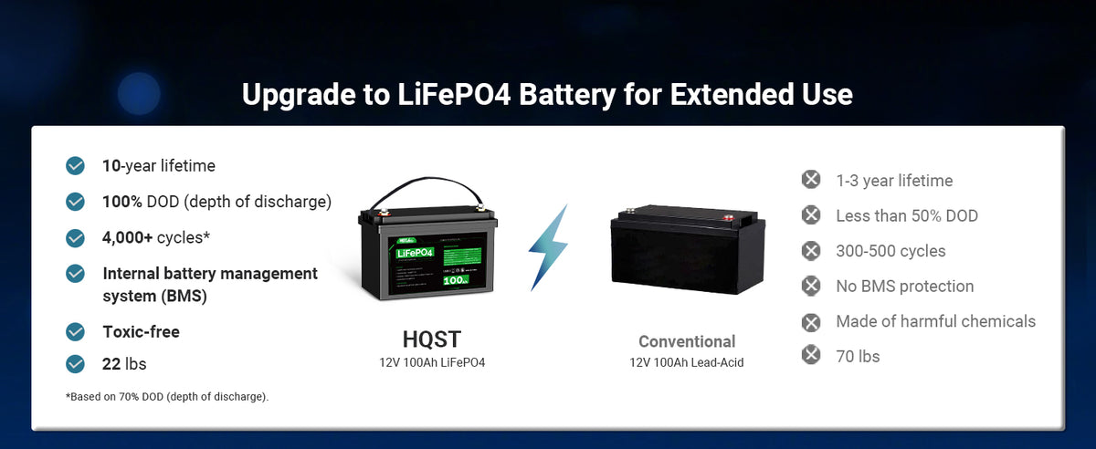 - [10-Year Longevity] HQST's 12V lithium batteries come with a reassuring 10-year commitment to both product quality and service life. This marks a significant advancement over lead-acid batteries, which usually last only 1 to 3 years. A perfect option to replace lead-acid batteries and enjoy extended durability.