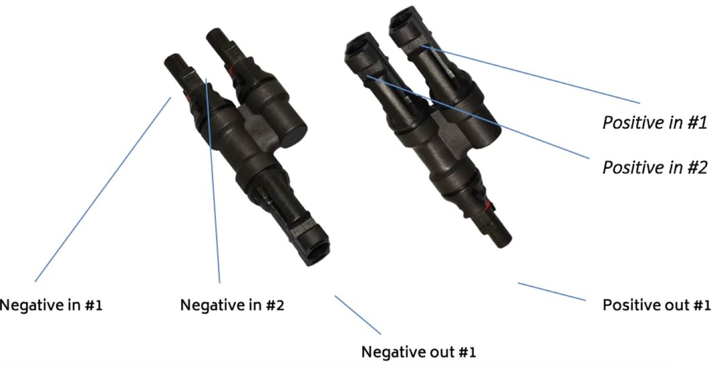 A Parallel connection is accomplished by joining the positives of two panels together, as well as the negatives of each panel together. This can be accomplished by different means, but usually for smaller systems this will be utilized via branch connector. The branch connector has a Y shape, and one has two inputs for positive, which changes to one, along with two inputs for negative, which changes for one. Please see picture below.