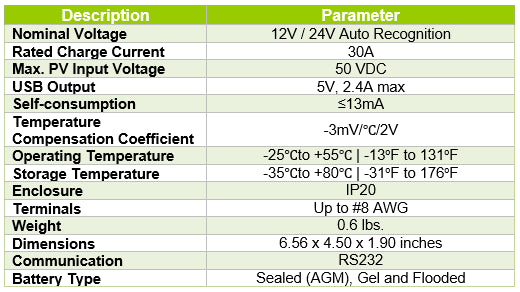 Firstly we want to look at the nominal system voltage. This will tell us what voltage battery banks the controller is compatible with. In this case, you can use 12V or 24V battery banks. Anything higher, such as a 48V battery bank, the controller will not be able to work on.