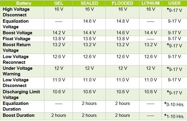 Boost charging voltage: A boost charge is a majority of what you will see when your battery is being charged. This is what does the majority of the job. As you can see it will vary from each battery type and in this specific controller the user can set their voltage level.
