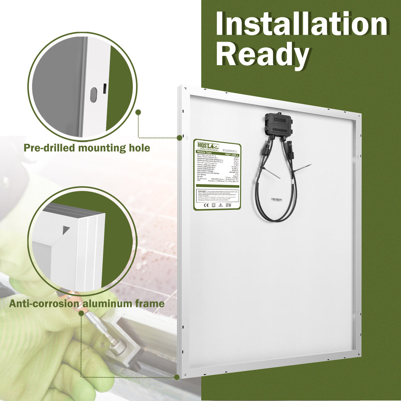 This HQST 100 Watt Polycrystalline Solar Panel is a fundamental but crucial component in establishing an off-grid solar energy system. Weighing in at only 14.1 lbs, this panel contains 64 efficient polycrystalline solar cells protected by a rugged and highly transparent layer of tempered glass. The panel is designed to withstand heavy snow (5400Pa) and wind loads (2400Pa). The back of the panel features a waterproof junction box, solar panel leads, and pre-drilled mounting holes for easy installation and use. Lower electricity costs are one of the best reasons to go solar.