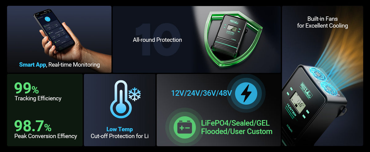 High-Efficiency MPPT: 99% tracking, 98.7% conversion. Supports 12V-48V systems.