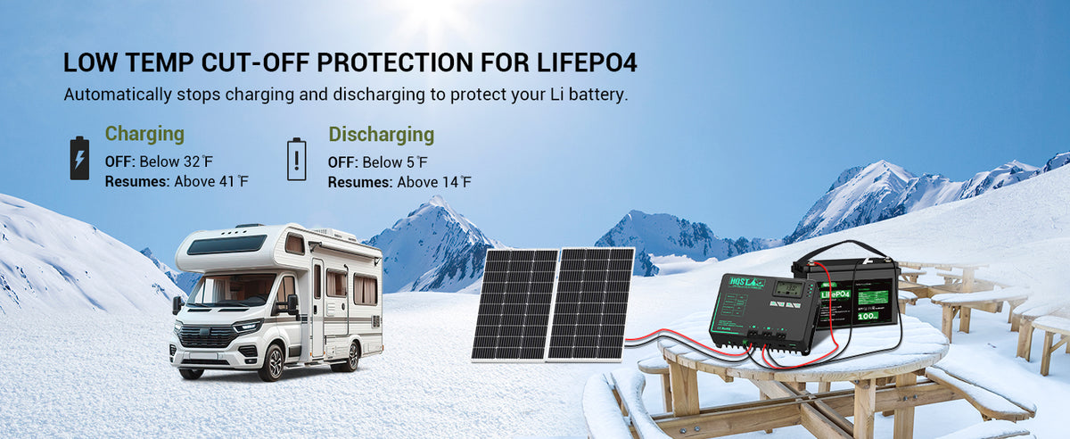 - [Low-Temp Cut-Off Protection for LiFePO4] The HQST 40A MPPT solar charge controller features low-temp charging (below 32℉) and discharging (below 5℉) cut-off protection for LiFePO4 batteries, preventing damage to your valuable batteries. You can manually switch on and off this function. The controller can also activate dormant LiFePO4 batteries that have turned off due to over-discharging.